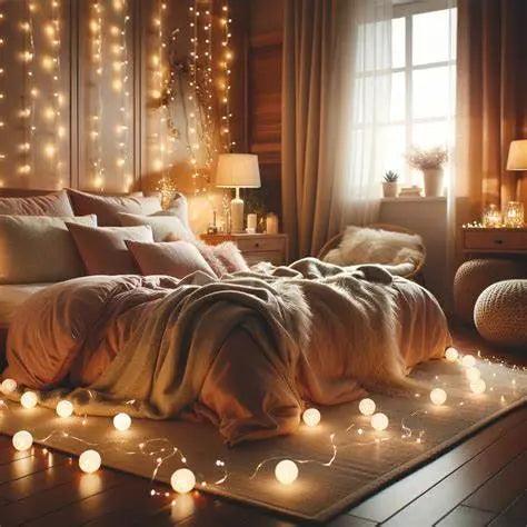 To create a warm and relaxing atmosphere in your bedroom, consider adding mood lighting. LED light strips installed behind the headboard or under shelves can create soft, subtle lighting that adds a touch of glamor to the room. Floor lamps or floor lamps can also be used to add soft, calming light to the entire room.